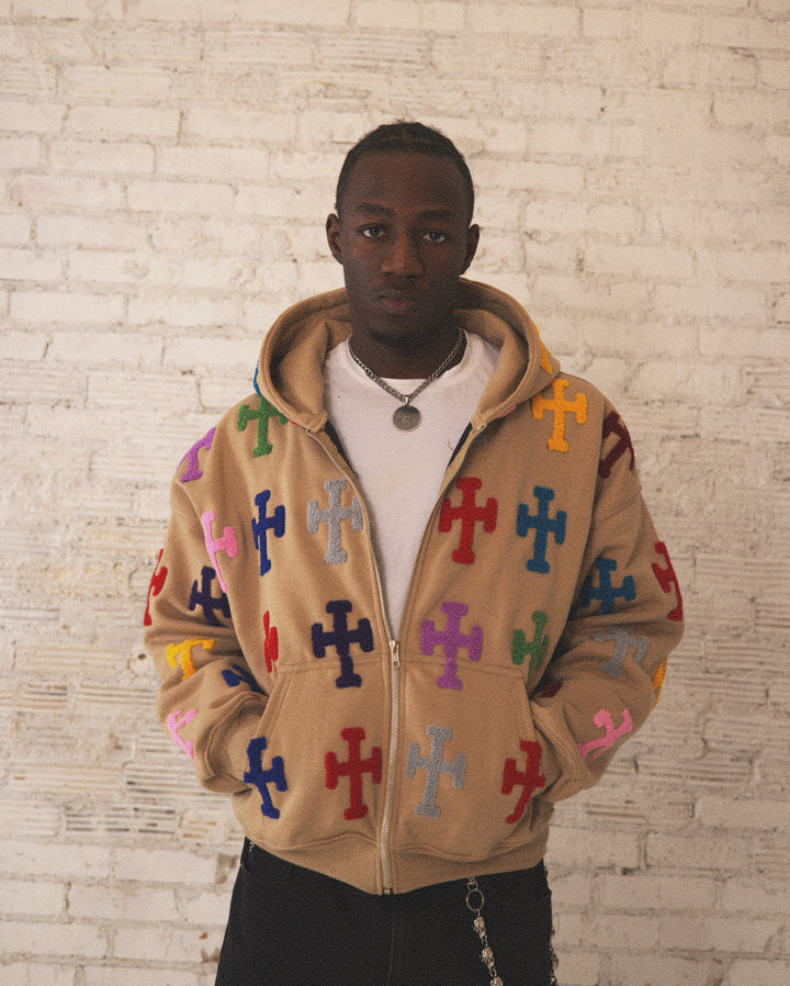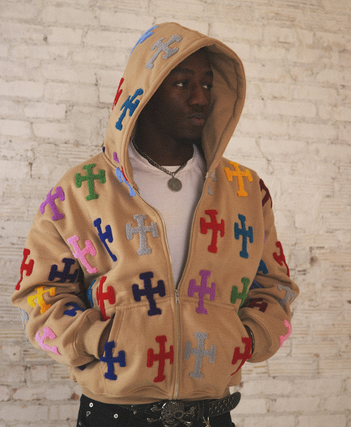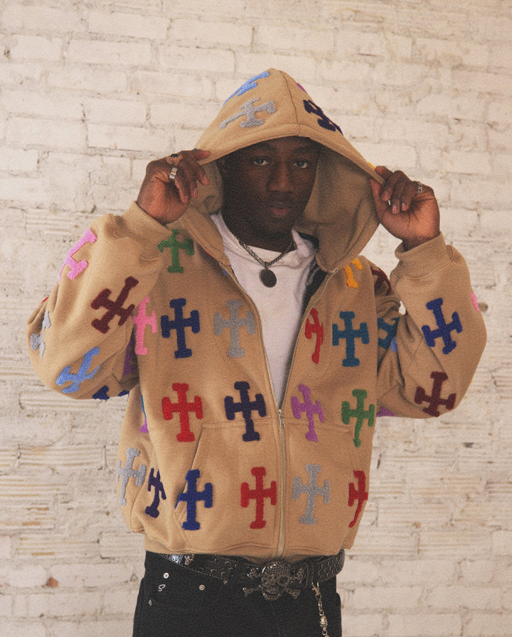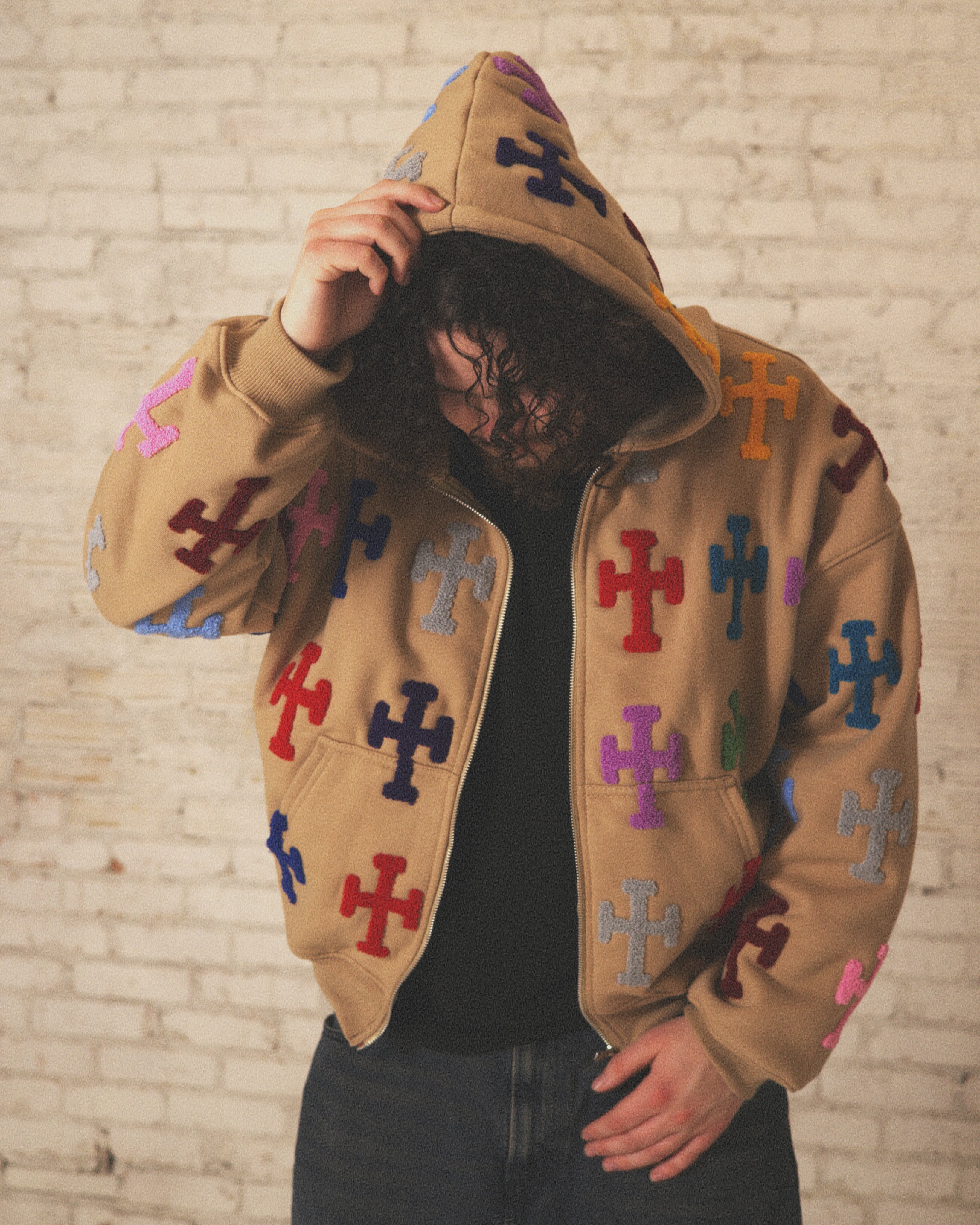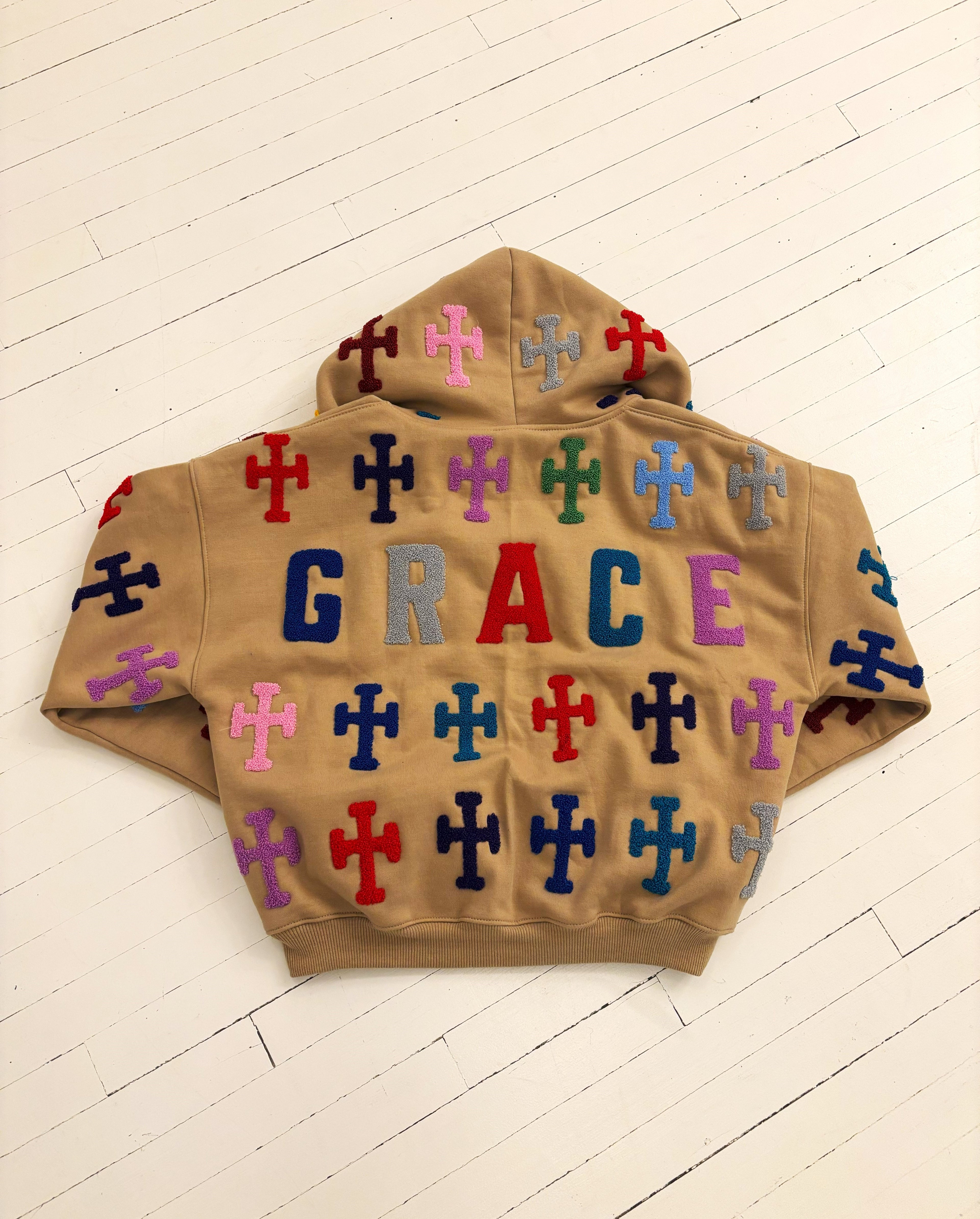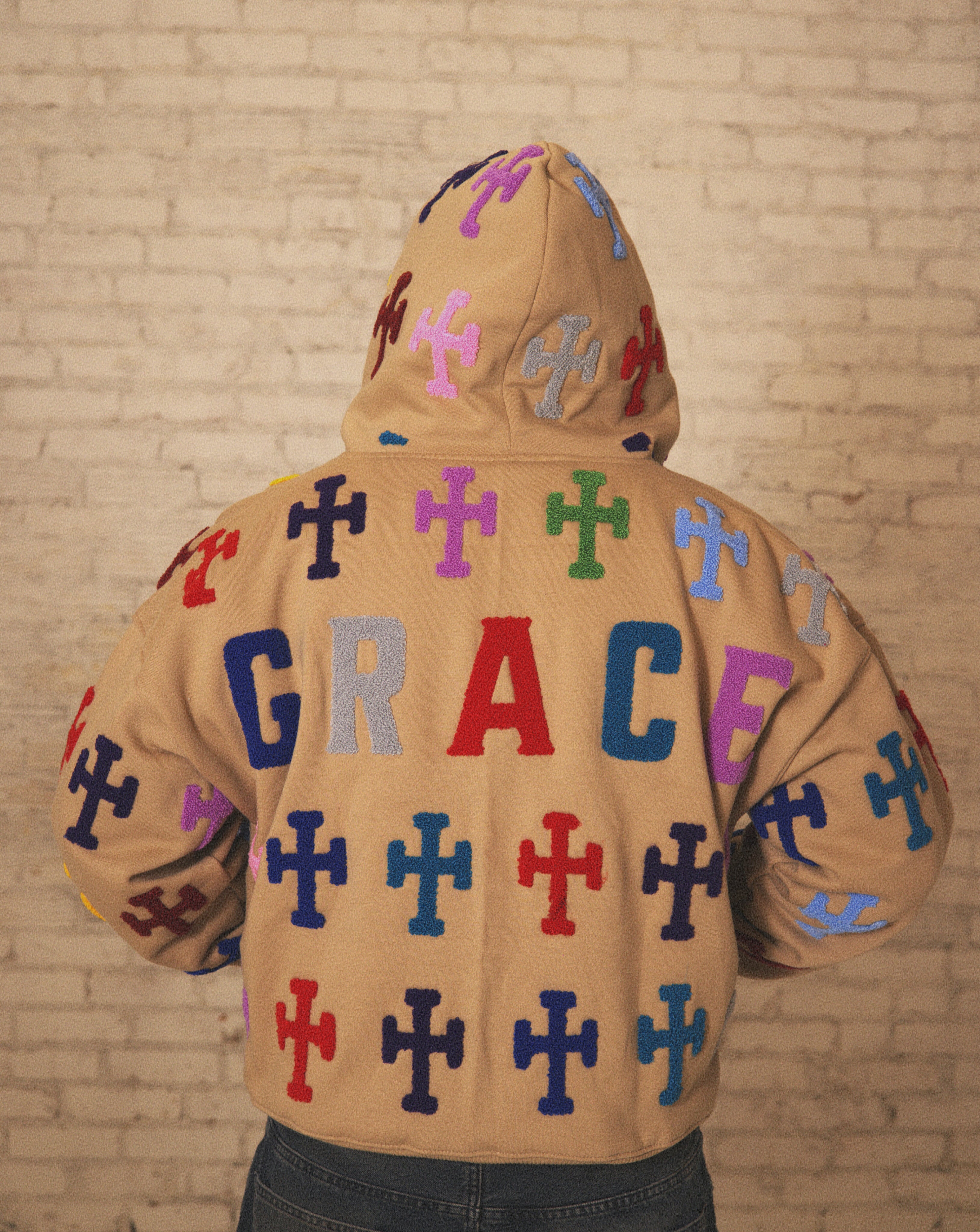 Print: Chenille-embroidered cross logos, "GRACE" embroidered across the back