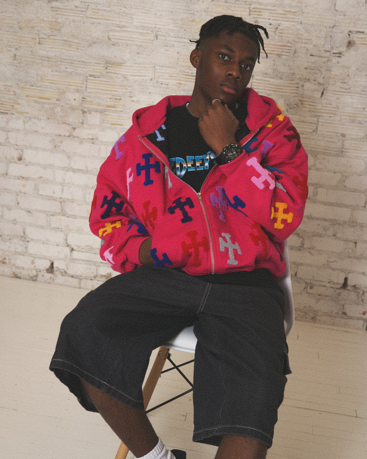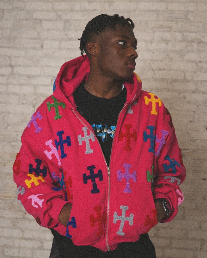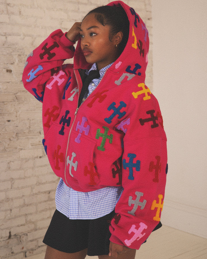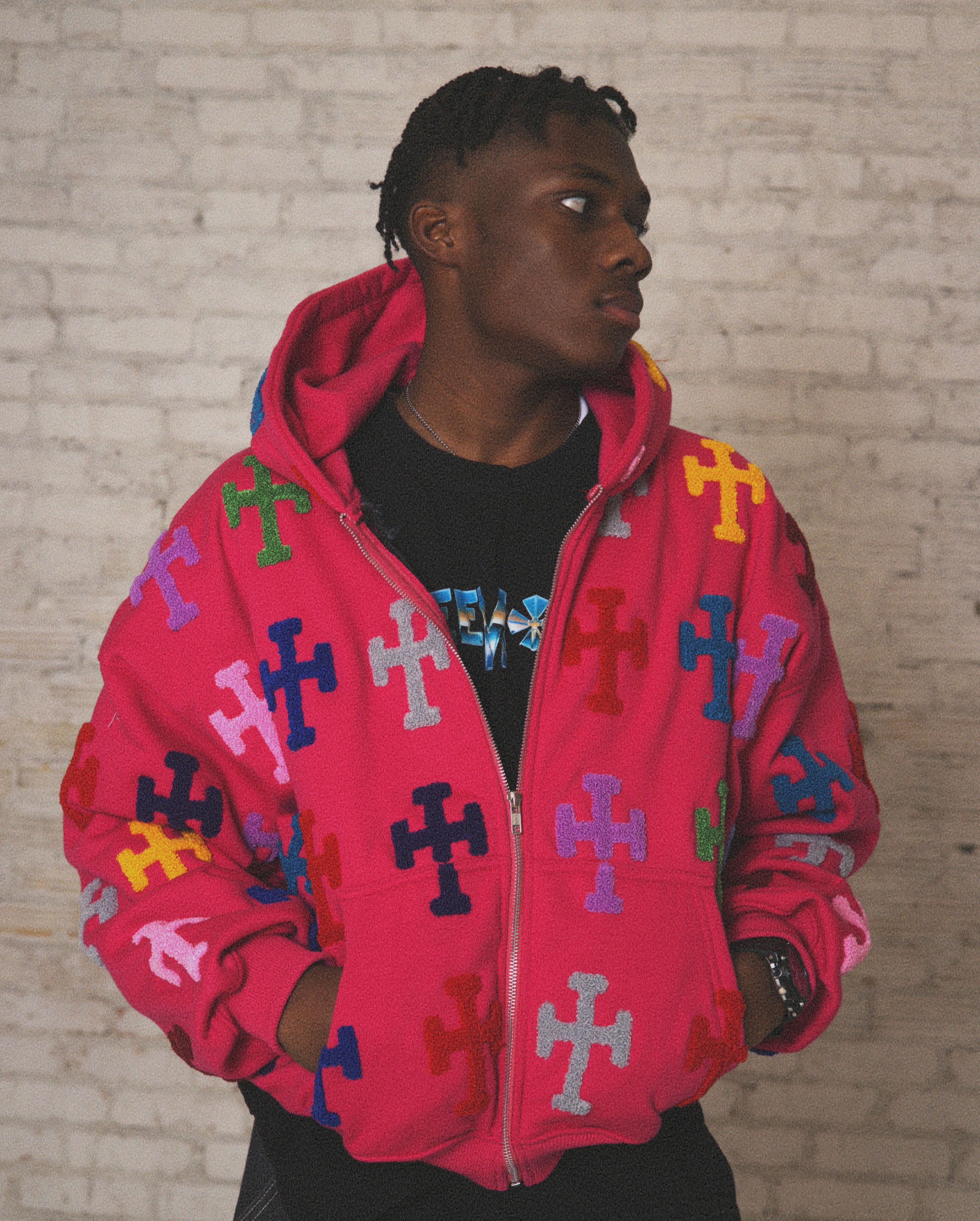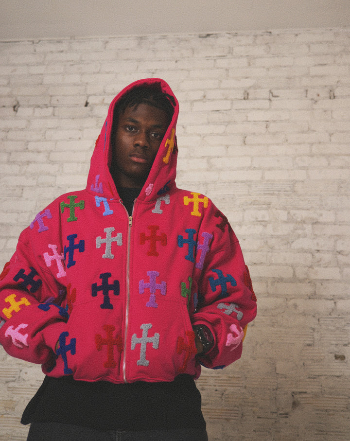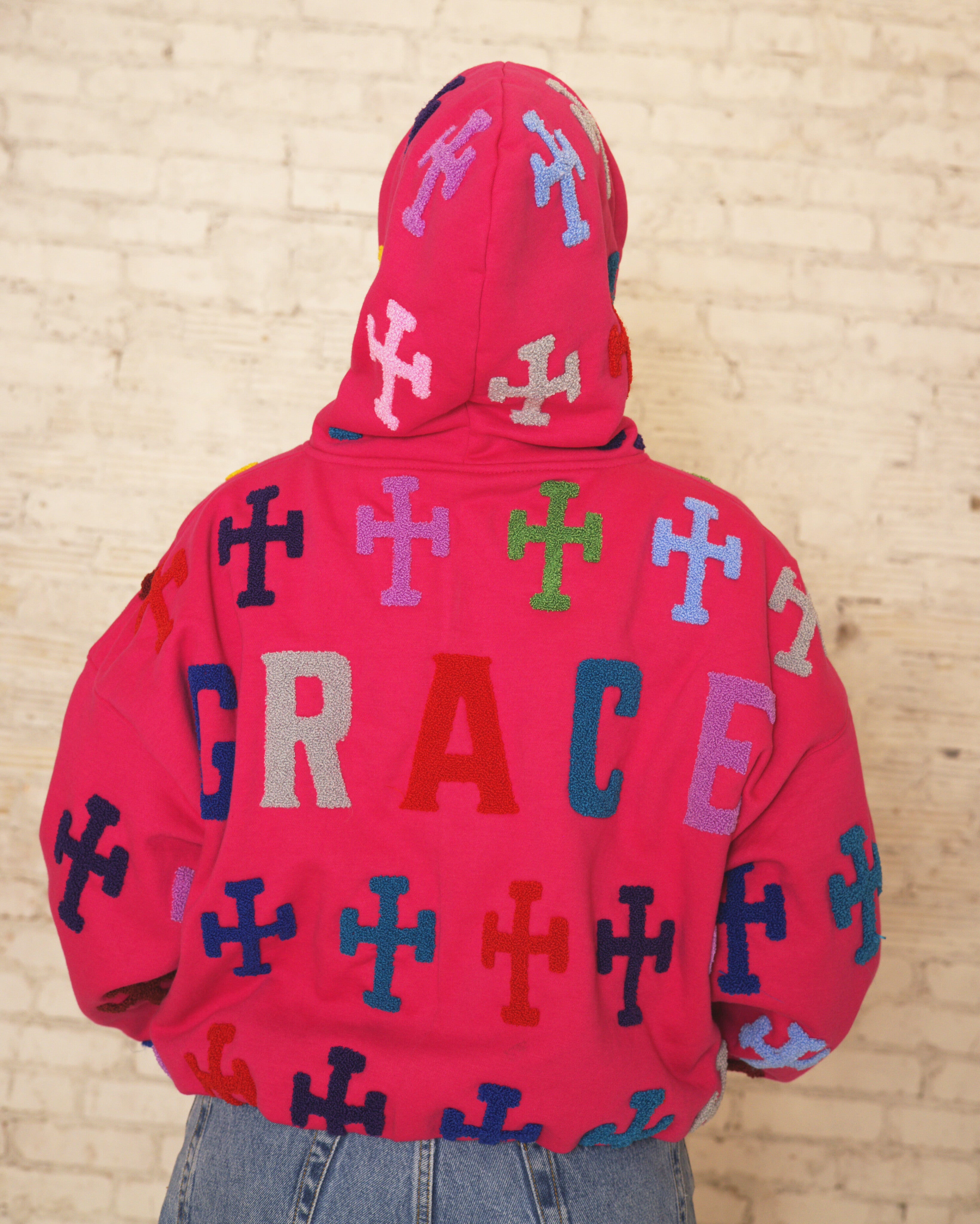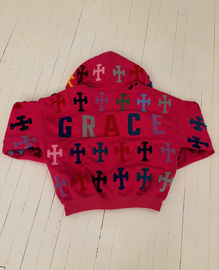 Print: Chenille-embroidered cross logos, "GRACE" embroidered across the back